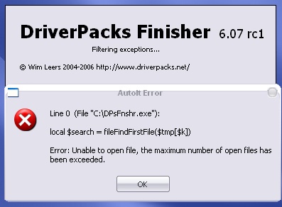 | 2006-07-31 11:14 | BashratTheSneaky | Summary | DP Finisher Error => AutoIt error: "unable to open file, the maximum number of open files has been exceeded." |