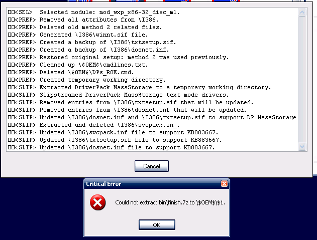 | 2006-06-09 13:52 | BashratTheSneaky | Summary | Critical Error: "Could not extract bin\finish.7z to $OEM$\$1 => M1, only DP M: Critical Error: "Could not extract bin\finish.7z to $OEM$\$1" |