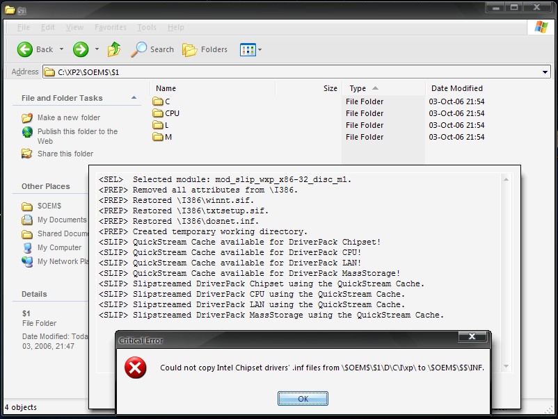 | Description | Error: "Could not copy Intel chipset driver's .inf files from \$OEM$\$1\D\C\I\xp\ to \$OEM$\$$\INF".Got this critical error (again) in the middle of the sleapstream process. It quits without going any further (why not, if other chipset drivers are OK?) I tried many times, after : - erasing the cache - reloading the Chipset pack - reloading all pack incl. DriverPacks Base (after 19h30 on oct. 1st) on a fresh clean HDD. Tried to execute DPs_BASE.exe under Admin account. Still no dice. It finally worked puting the Chipset pack in the 3rd party directory. | |||||||