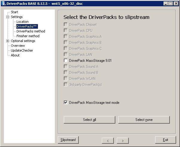 | Description | You can select the box "DriverPack MassStorage text mode" without checking the box "DriverPack MassStorage" [see picture]. If I have properly understood, you have to check both boxes. It would be nice, if the "DriverPack MassStorage" will be checked automaticly if you select the Text Mode Driver. | |||||||